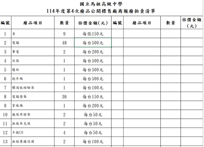 114年馬祖高中拍賣報廢物品1批 --閱讀人次 : 286 1.本拍賣品為已達使用年限之報廢品,現況無法保證堪用,購買前請審慎考慮。