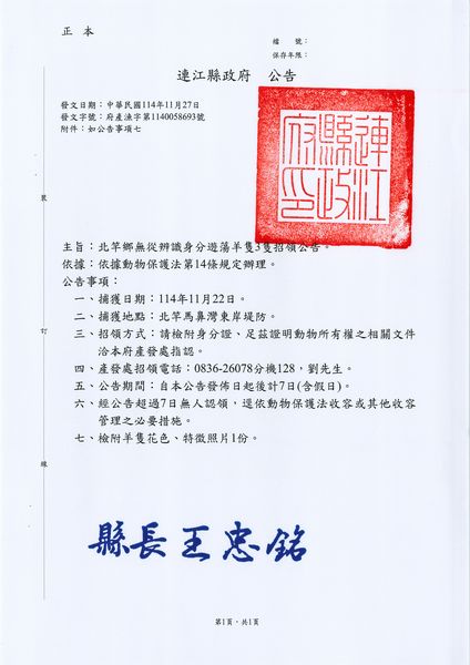 1.標題:北竿鄉無從辨識身分遊蕩羊隻3隻招領公告