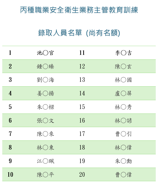 丙業主管訓練錄取名單(尚有名額) --閱讀人次 : 259