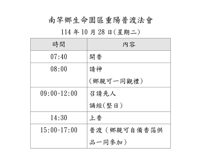 南竿鄉公所訂於114年10月28日(二)辦理本鄉生命園區重陽普渡法會,設壇及延聘法師誦經祈福,邀請各位鄉親前往觀禮及上香祭祖。