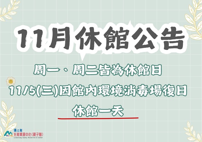 南竿親子館11月行事曆及休館公告 --閱讀人次 : 188 溫度急轉直下的十一月份來啦