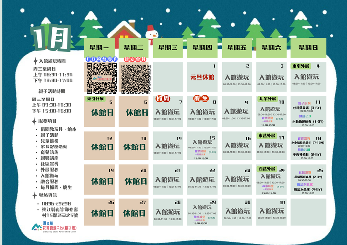 南竿親子館115年01月行事曆 --閱讀人次 : 529 很冷冷的一月份來啦