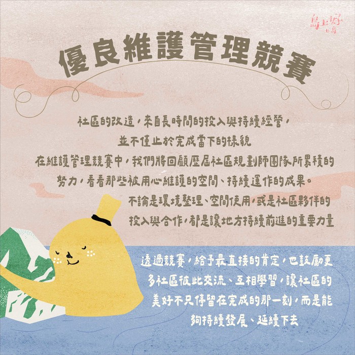【社區規劃師】優良維護管理競賽開跑! --閱讀人次 : 394 社區的改變,從來不是完成的那一刻最風光