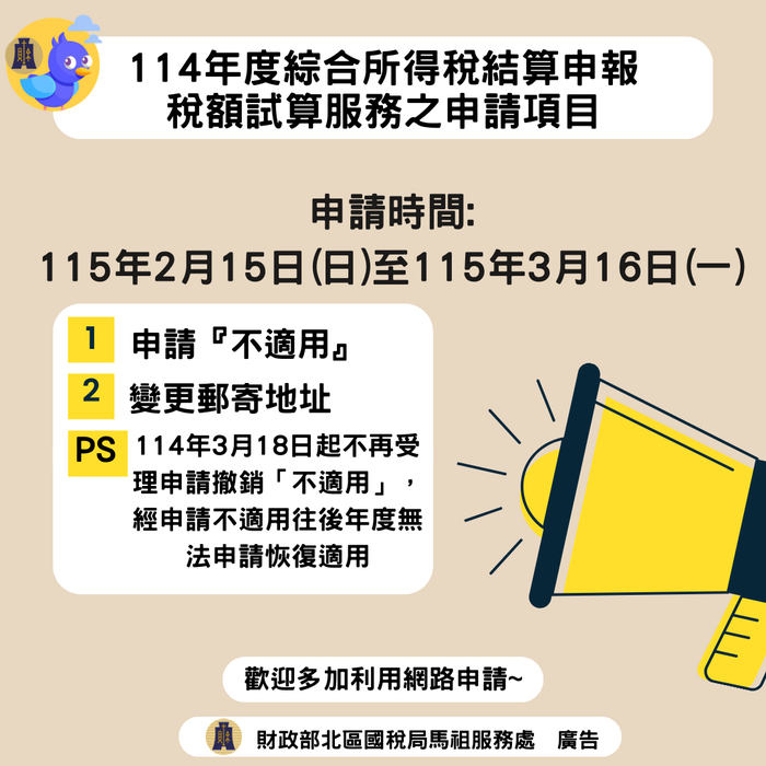 ★提醒您,自114年3月18日起不再受理撤銷原申請不適用稅額試算服務,