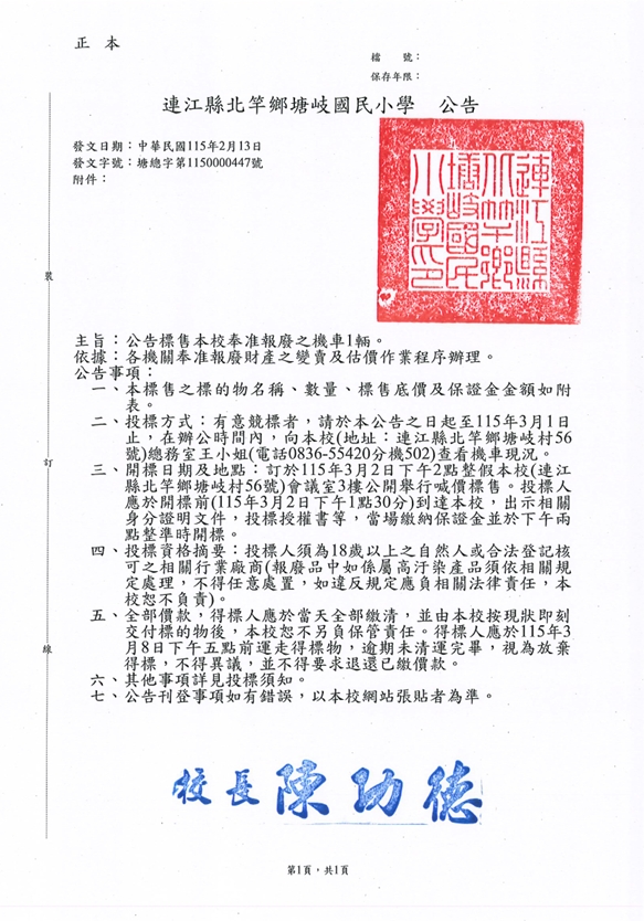 塘岐國小拍賣公務機車1台(第2次)