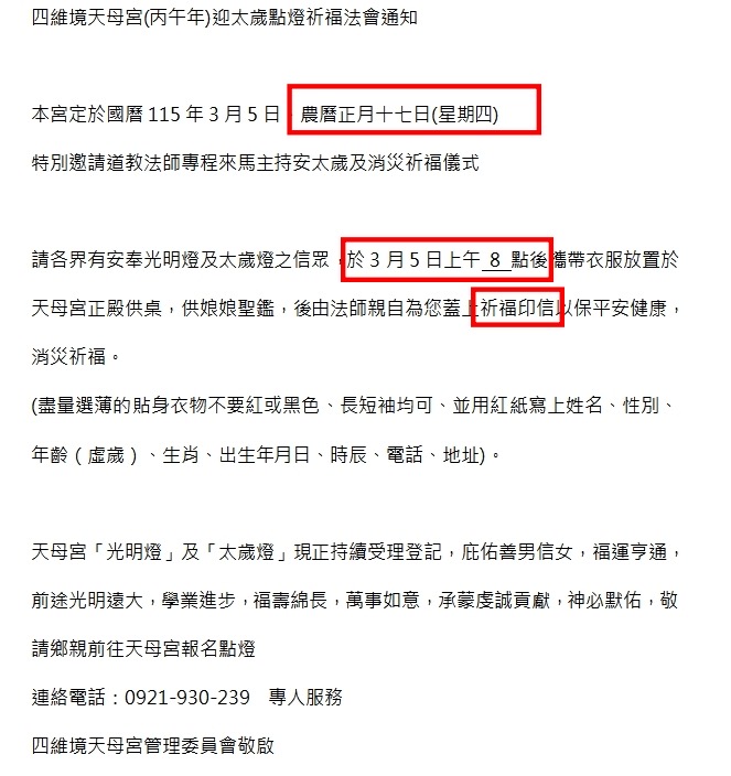 四維境天母宮迎太歲點燈祈福法會通知