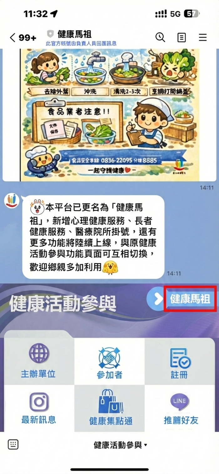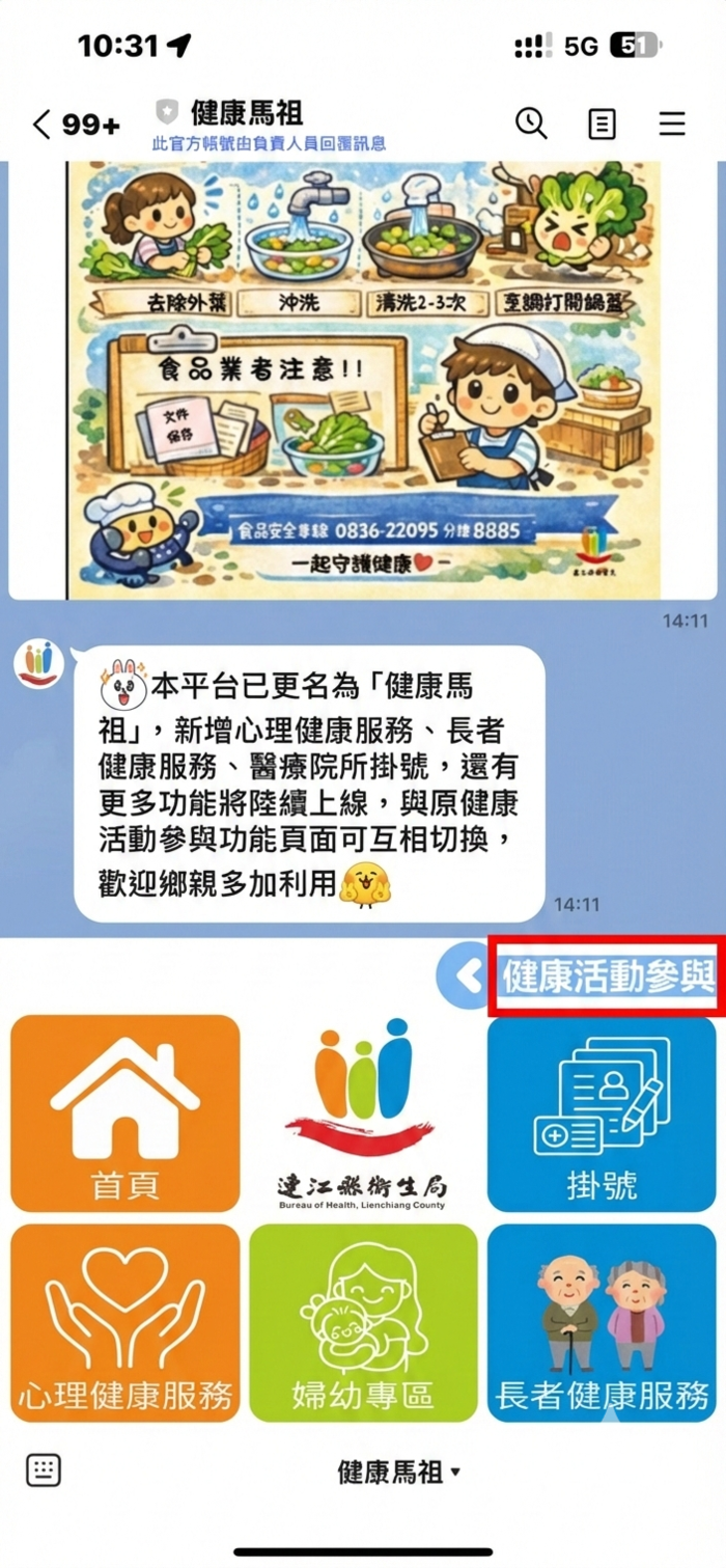 衛生局官方Line帳號為「健康馬祖」 --閱讀人次 : 688 連江縣健康活動參與平台」官方Line帳號今年起已更名為「健康馬祖」,新增心理健康服務、長者健康服務、衛生所掛號,還有更多功能將陸續上線,在手機下方功能頁面點選『紅框處』可互相切換平台功能,請鄉親點選『健康馬祖』後點選『首頁』圖示並依提示完成個人帳號註冊,即可開始使用多項新增功能,註冊完成後可在個人健康數據中查詢到114年整合式健康篩檢報告數據資料。敬請鄉親多加利用。