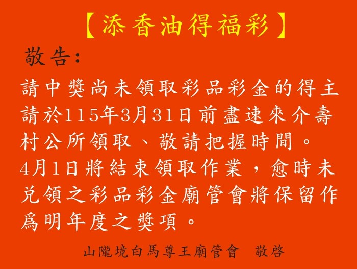提醒公告:3/31請速領《添香油得福彩》彩金彩品