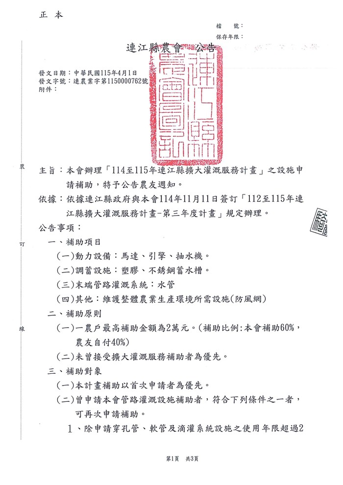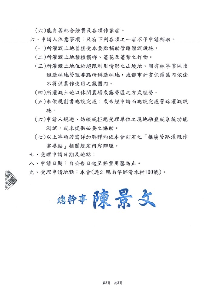 連江縣擴大灌溉設施申請補助 --閱讀人次 : 44 本補助以先申請為優先辦理,直至經費用鑿為止。
