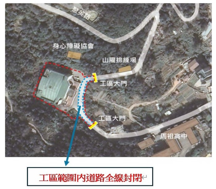 本公司為辦理「連江縣政府聯合辦公大樓新建統包工程」預計於115年4月7日起進行既有體育館拆除作業,為了鄉親及施工安全起見,工區範圍(山隴排練場至馬祖高中段)道路全線封閉,請用路人配合改道,造成不便,敬請見諒。