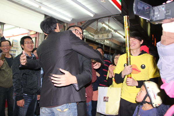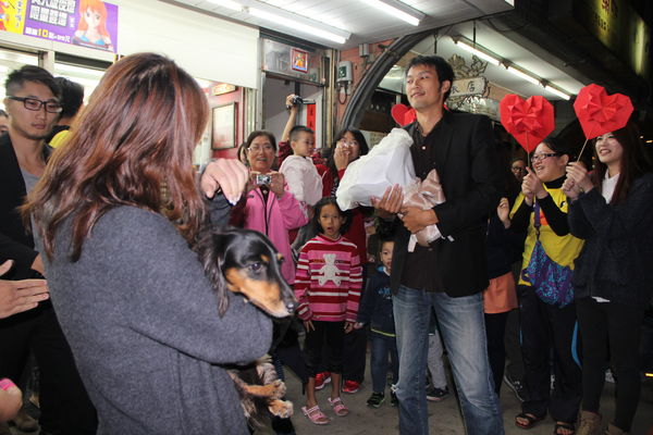 昨晚 7 時 30 分,楊意秋被男友以「幫朋友求婚打氣」為名義,帶來山隴現場,隨後上百名群眾簇擁著建設局曹立功與女友許文瑄到場,作勢求婚,但隨即話鋒一轉,把鮮花交給曾傳鈞。