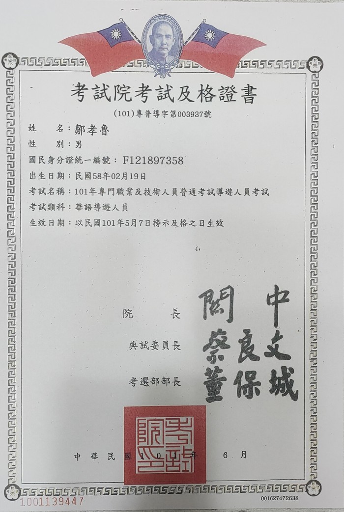 鄒孝魯地政士除經過國家考試取得地政士資格外,更具有國家考試之不動產經紀人,導遊及領隊考試及格證書,擁有地產黃金雙證照及旅遊黃金雙證照,除了是一位多材多藝的專業地政士外,更是一位風趣幽默的諮詢人員