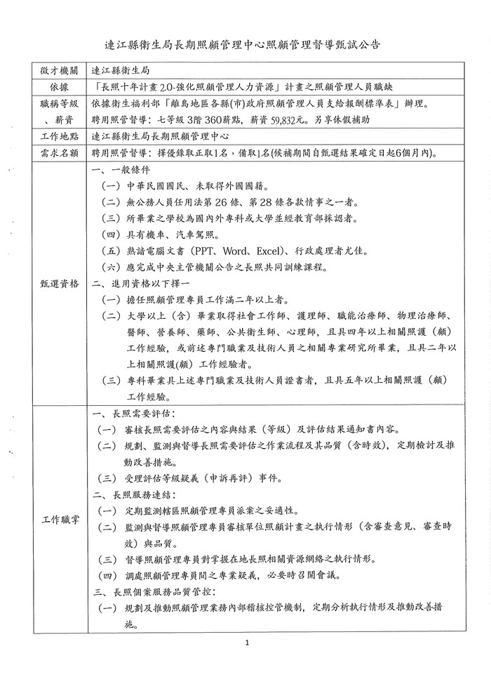 衛生局徵選長照2.0計畫聘用照管督導1名
