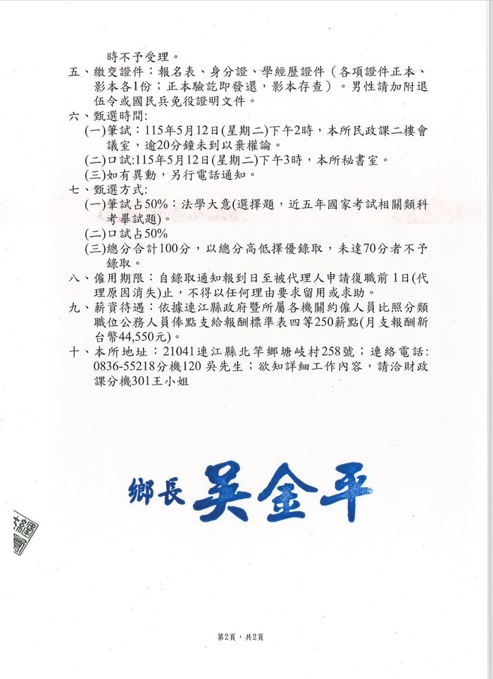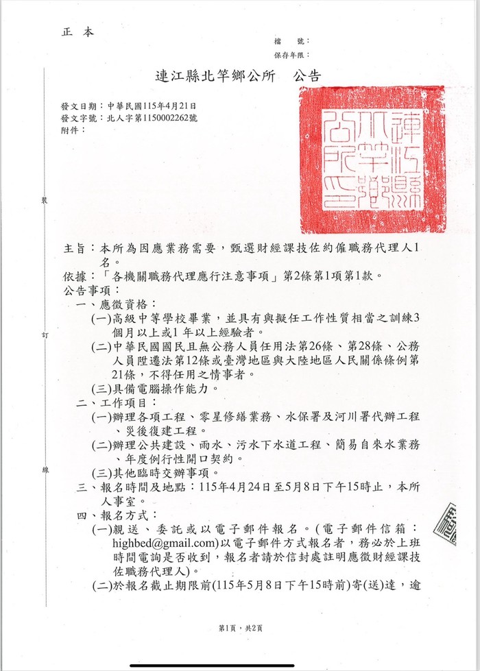 北竿鄉公所甄選財經課技佐約僱職務代理人1名。