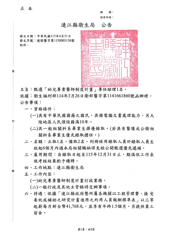 連江縣衛生局甄選幼兒專責計畫專任助理1名