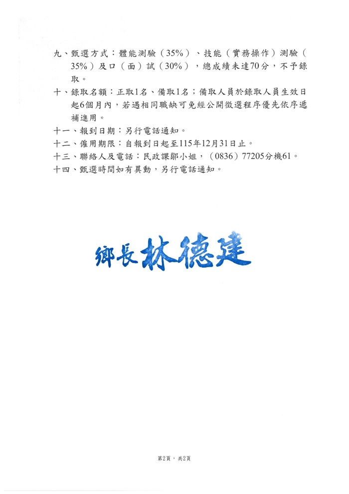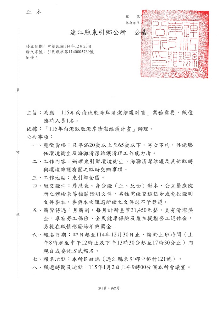 東引鄉公所徵計畫臨時人員一名