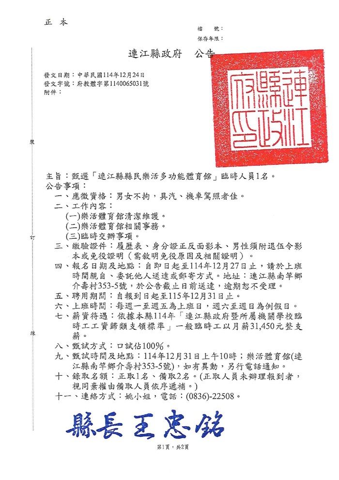 連江縣縣民樂活多功能體育館徵選臨時人員1名