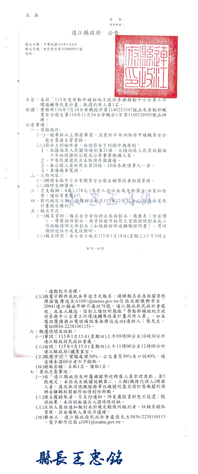 (三)採電子郵件或紙本寄送方式報名,請將報名表及相關資料掃描後傳送至A1091@matsu.gov.tw信箱或掛號郵寄至「20941連江縣南竿鄉介壽村76號。連江縣政府民政社會處收」或本人親送,信封上請註明應徵「勞動部補助地方政府參與中小企業工作環境輔導改善計畫約用人員」。如未獲回覆請務必電話確認有無傳送成功(連絡人:張先生,電話0836-22381#6115)。請下載報名表