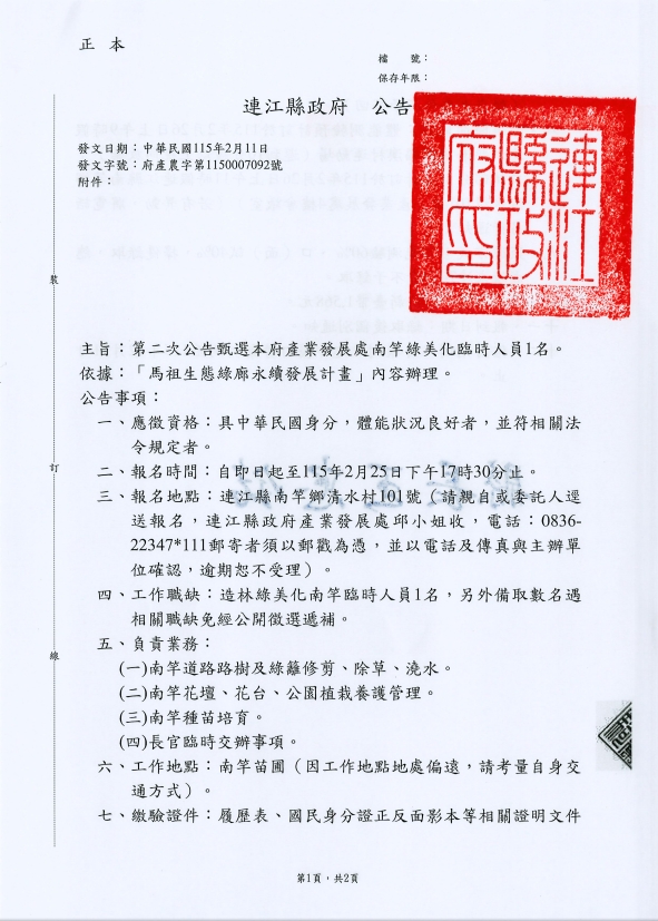 第二次公告徵選連江縣政府產業發展處南竿綠美化臨時人員1名