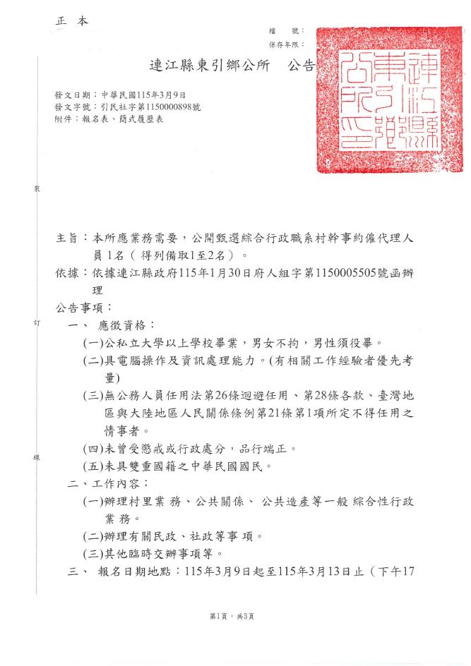 東引鄉公所第二次村幹事約僱職代公告