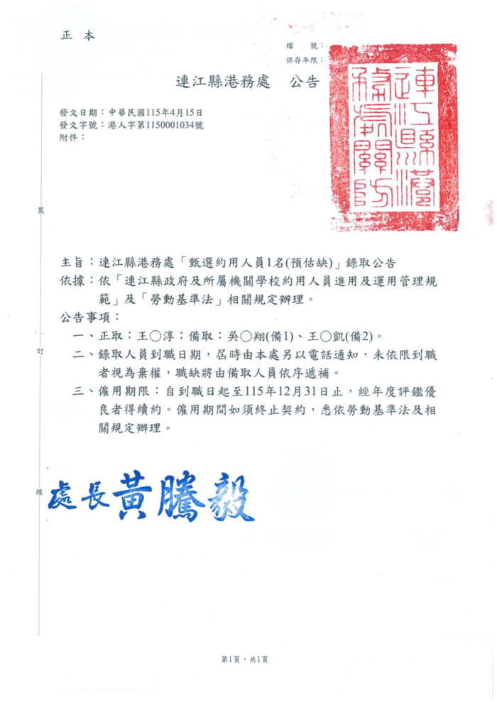 連江縣港務處「甄選約用人員1名(預估缺)」錄取公告 --閱讀人次 : 589 主旨:連江縣港務處「甄選約用人員1名(預估缺)」錄取公告